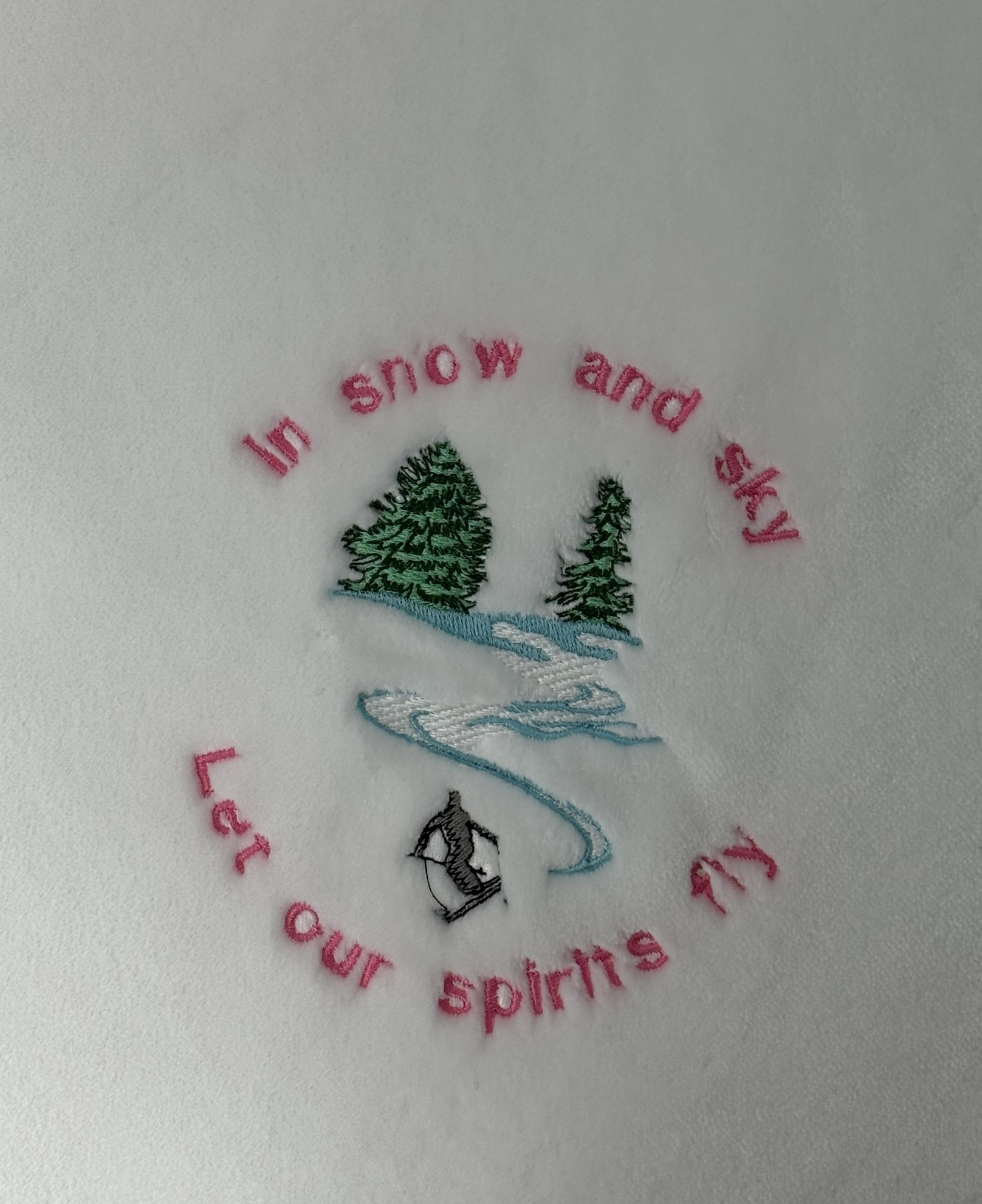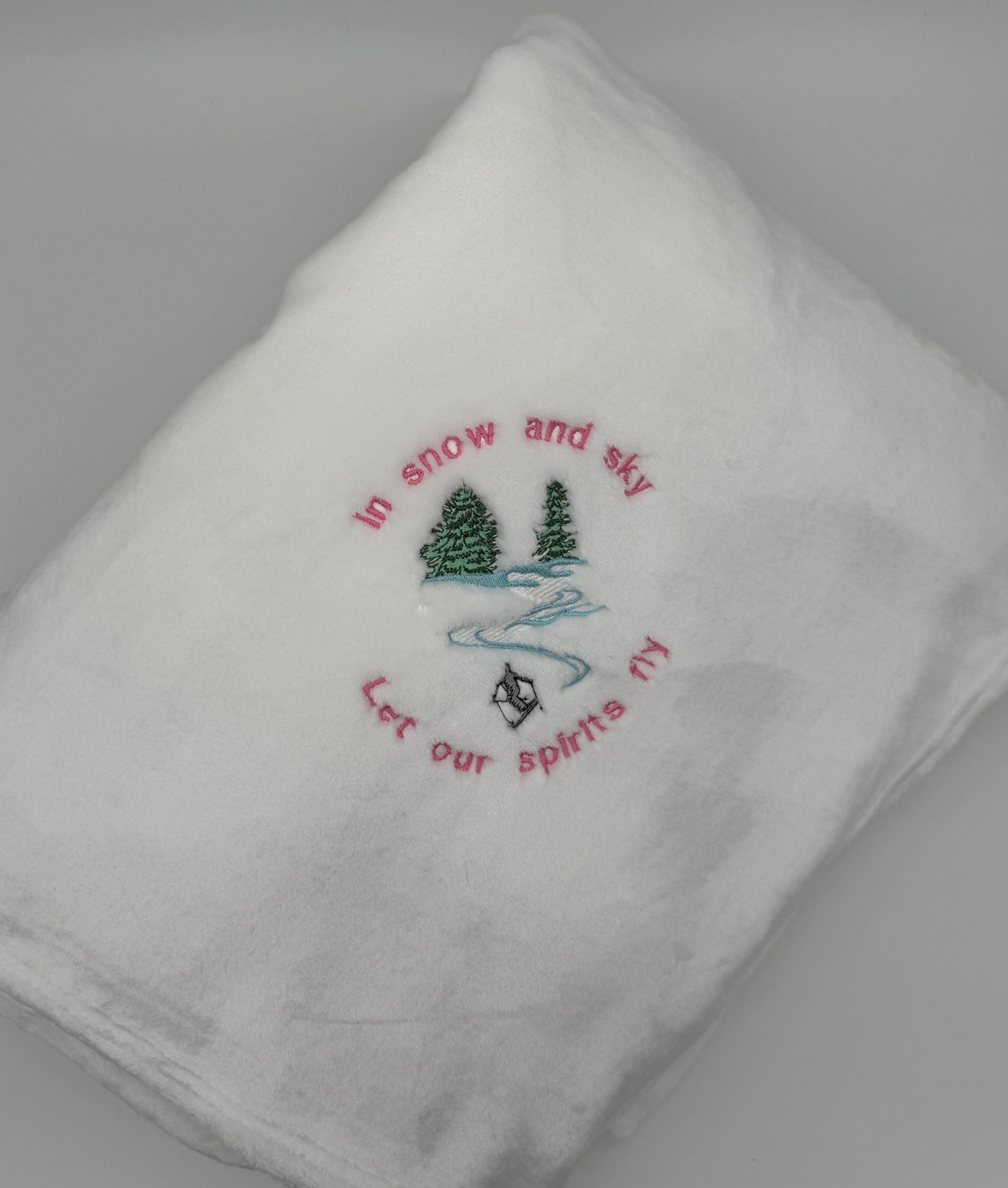 Large Soft Luxurious White blanket with embroidered picture of a skier coming down the mountain and the words "In Snow and Sky Let our Spirits Fly"